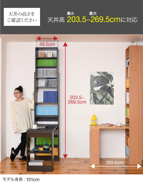 デスク 天井 突っ張り 本棚 付き 幅90 奥行45 高さ204 から 高さ249 デスクラック 薄型 スリムデスク コンパクト ラック 本棚 壁面パソコンデスク 書斎机