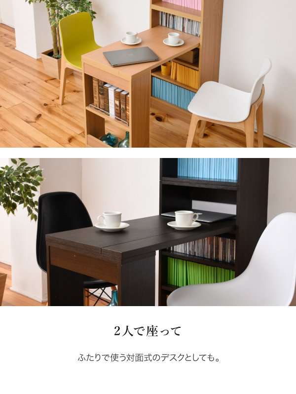 これ1台でデスクとたっぷりの収納が手に入る、デスク&突っ張りサイドラック。どちらの脚も収納スペースになっているので、デスク周りがすっきり片付きます。ラックには本や資料を並べたり、小物や雑貨をディスプレイするなどその使い方はさまざま。天井に突っ張ることのできる高さ調節機能と専用金具付きなので安心。