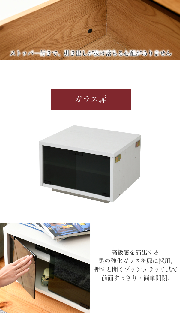 左右の収納は引き出し、フラップ扉、ガラス扉の3種類からお好きな組み合わせを選んでいただけます。大型テレビを置いても雑貨をディスプレイしても使える幅180cmのワイドデザイン。お部屋の圧迫感を軽減するロータイプ設計です。