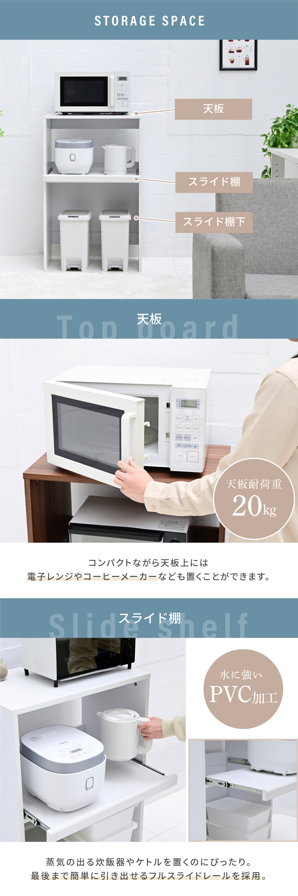 ゴミ箱の上のデッドスペースを有効活用できるキッチンラック"Mansarda"。天板にはレンジを置くことができる他、コンセント付きのスライド棚は炊飯器やケトルなどの家電を収納するのにぴったり。オープン部はゴミ箱だけでなく、小さめのラックなどの収納スペースとしてもおすすめです。