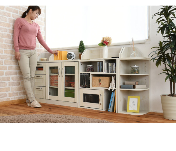 カウンター下のスペースを活用する、カウンター下収納。カントリーな雰囲気を醸し出す、木目調のデザインが美しいチェスト。引き出しが3杯ついているので、取り出しやすいところに置いておきたい日用品を収納するのにとても便利。