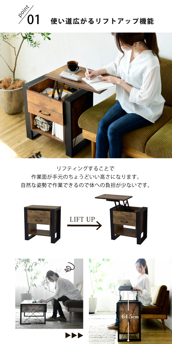 ソファサイド テーブル 昇降式 サイドテーブル ナイトテーブル ブルックリン ソファ横 ベッドサイド デスク横 引き出し 収納 おしゃれ テレワーク リフティング