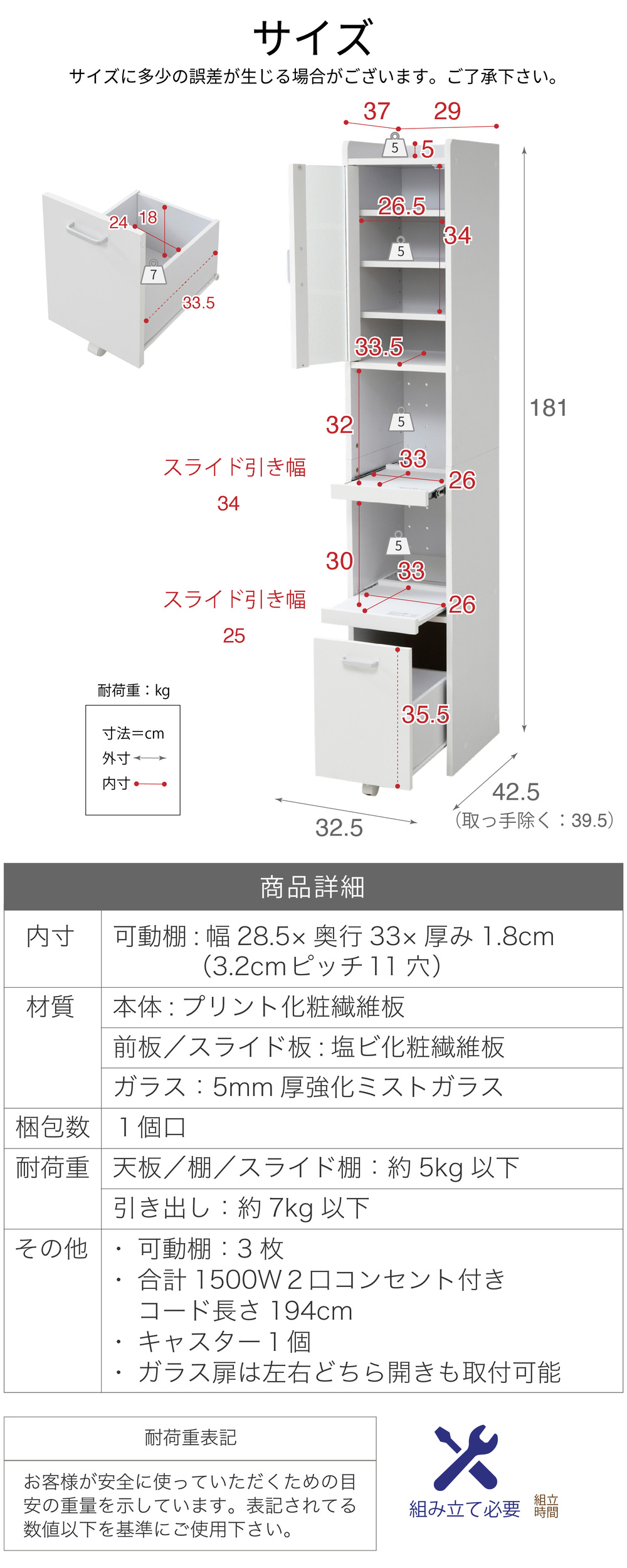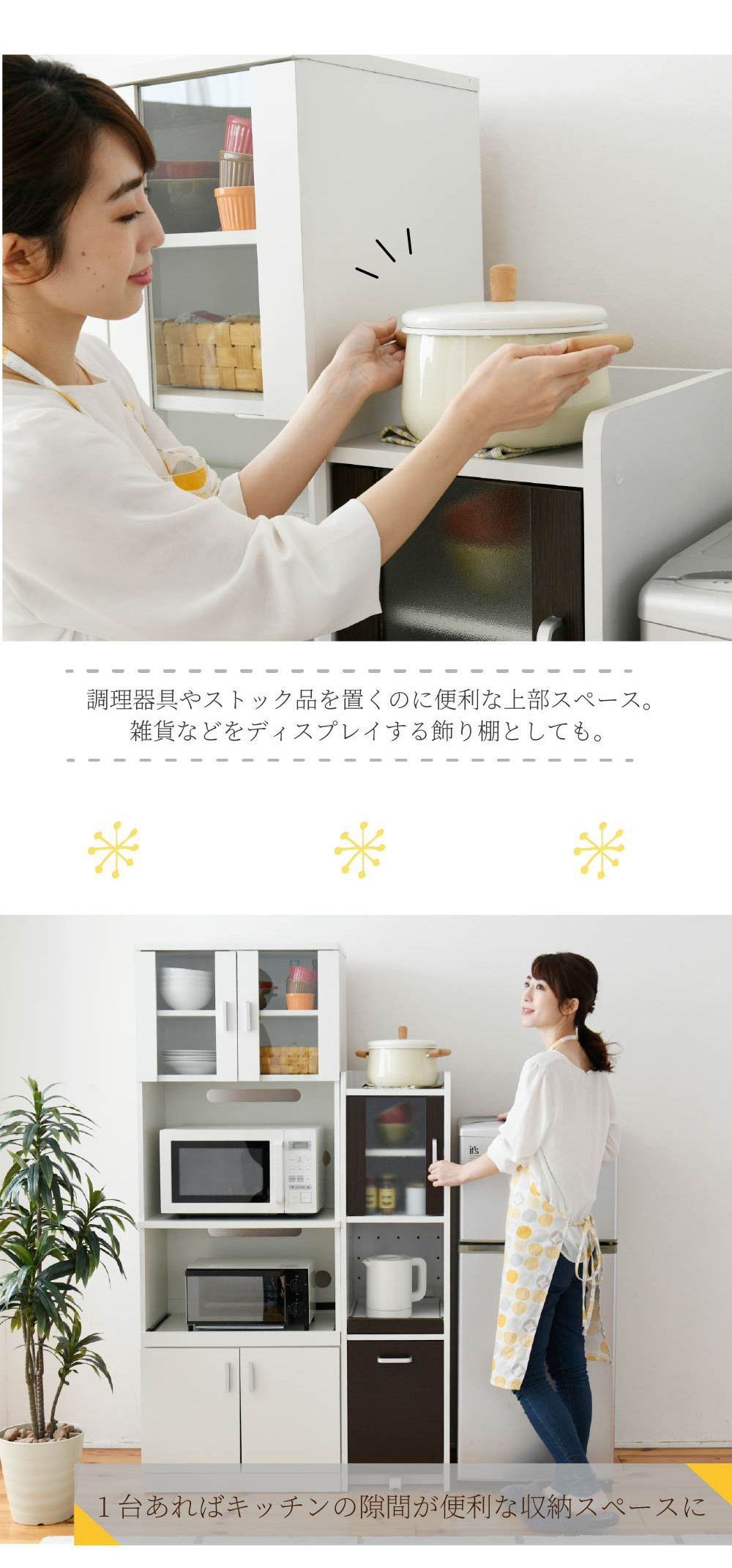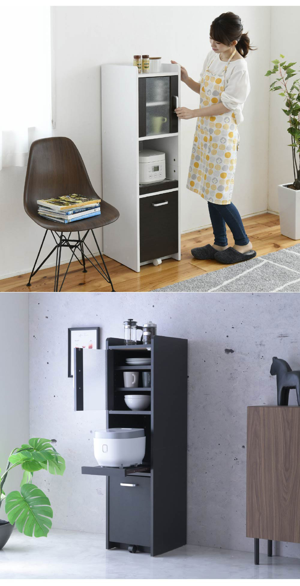 隙間に最適な、幅32.5cm、高さ124cmのロータイプスリムラック。 上段は、お気に入りの食器をおしゃれに隠す「擦りガラス扉」。 収納物に合わせて高さを変えられる可動棚2枚付きで、組立時に扉の左右も選べます。 中段は炊飯器 台に最適なスライド棚1枚。 2口コンセントと、背は熱を逃すパンチング加工付きで安心です。 下段は2Lペットボトルも入る深型引き出し。 重くても開けやすい専用キャスターが付いており、食品ストックの収納に便利です。