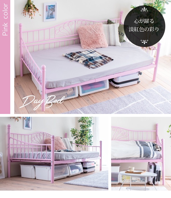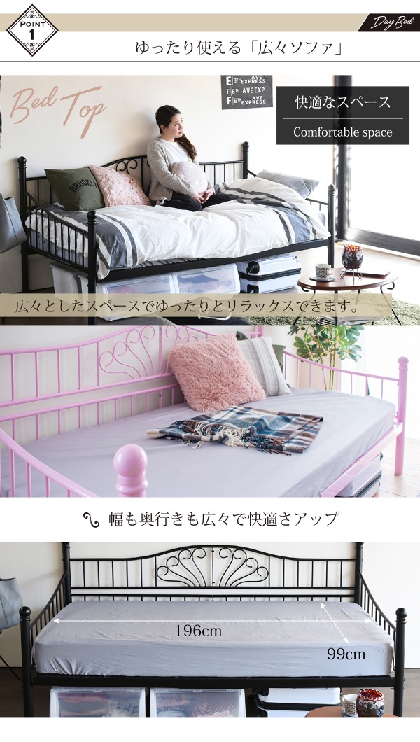 昼はソファ、夜はベッドと、2つのスタイルで使えるアンティーク調のデイベッド。ロートアイアンの装飾がエレガントな空間を演出し、アンティーク調の家具や小物との相性もバッチリ。