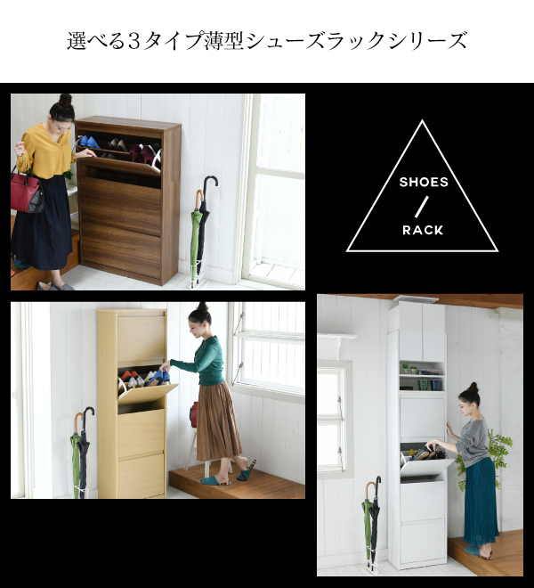 玄関の限られたスペースでも場所を取らない薄型設計のシューズボックス。扉がフラップ仕様になっており、玄関にあふれた靴をすっきり収納できて見た目もスタイリッシュ。ワイドタイプは高さが123cmと低めなので、写真や雑貨をディスプレイしたり出かける際に持ち歩く鍵や定期入れなどを置いたりするのにもぴったりです。