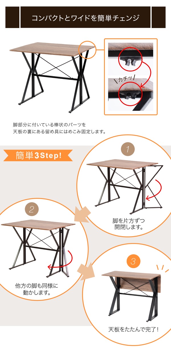 シーンに合わせて天板サイズを変更できるダイニングテーブルにイス2脚が付いたダイニング3点セット。普段はコンパクトに、来客時には天板を広げてワイドに。限られたスペースを上手に使えるフレキシブルなテーブルです。サイズの切り替えは簡単なので女性の一人暮らしにも。デスクとして使うのもおすすめです!