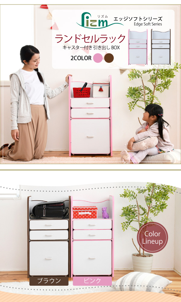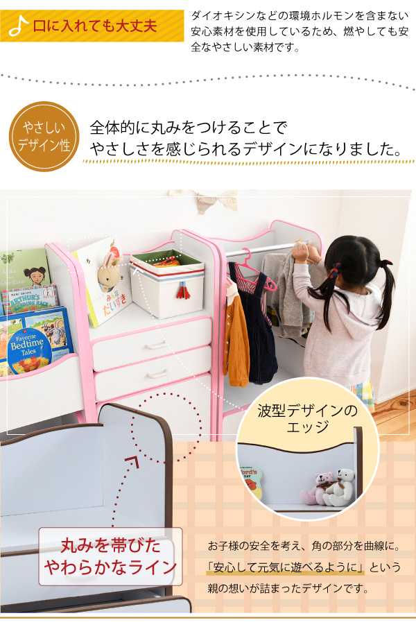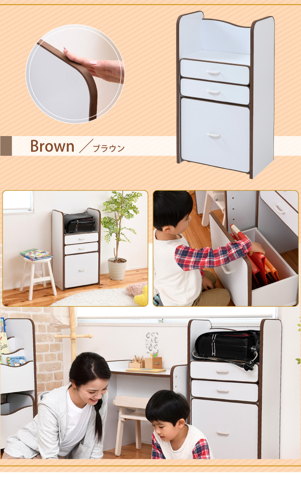 弾力性、衝撃吸収に優れたEVA樹脂をすべてのフチに採用。さらに角を丸くして金具の使用を極力減らした、小さなお子様も安全にご使用いただけるシリーズです。ランドセルを置くのに最適なスペースの天板や大きさの異なる引き出しなど多様な収納部が、お子様の整理整頓の力をアシスト。自分で考えてお片付けをする習慣が身に付きます。大きい引き出しはキャスター付きなのでお子様の力でも楽々引き出せます。