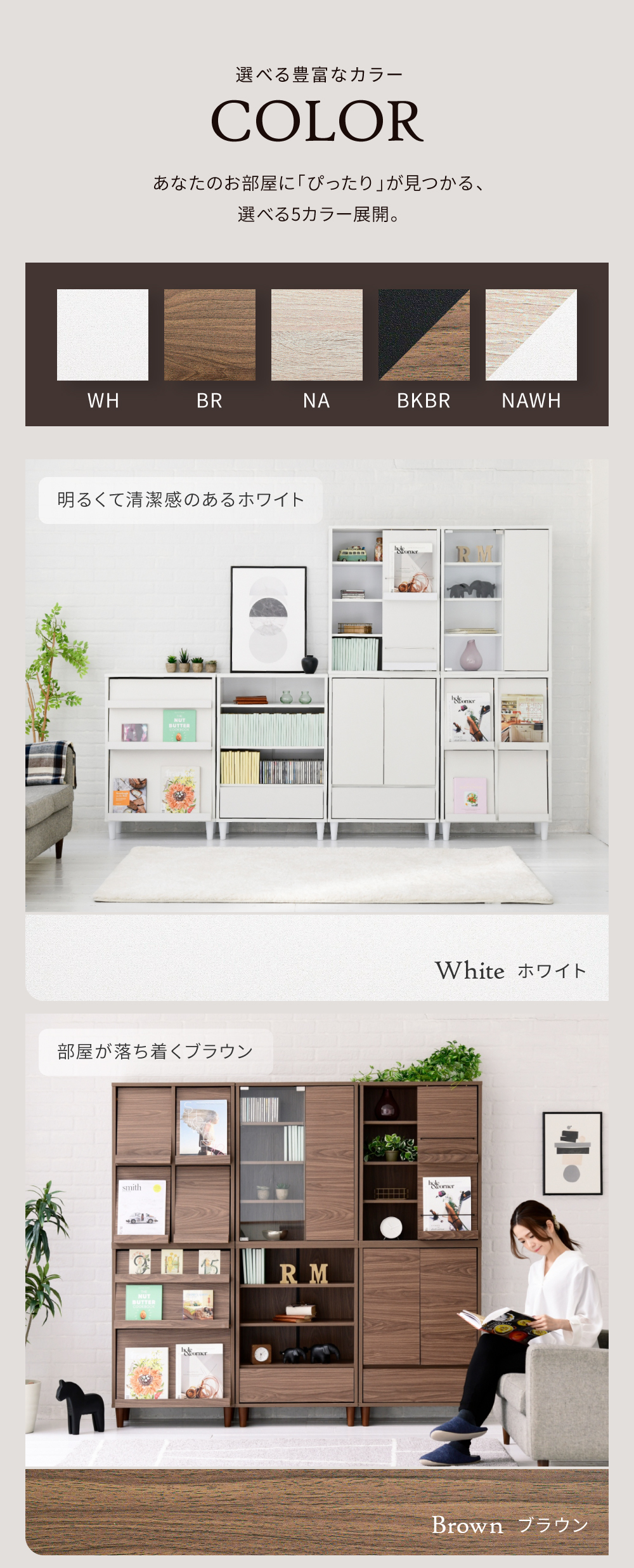 オープン&チェスト。6つのデザインと5つのカラーからお選びいただける6デザインキャビネット”Adatto”。オープン部分にはディスプレイ、引出しには見せたくないものを収納。