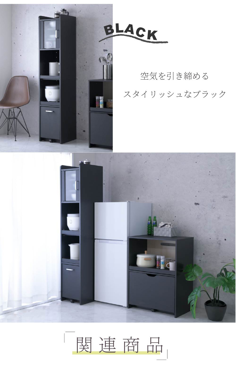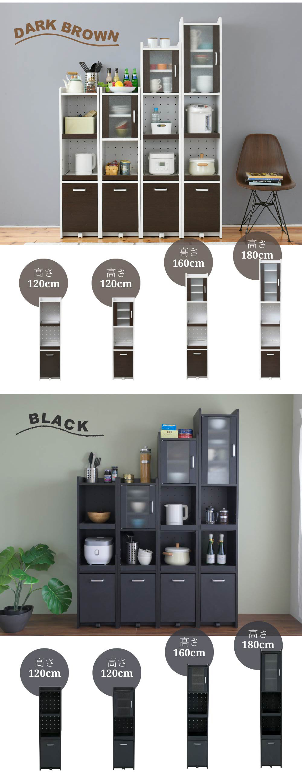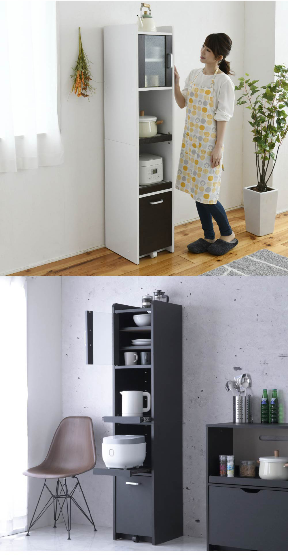 幅32.5cmの隙間に収まる、高さ161cmのミドルタイプ収納棚。 上段は食器棚に最適な「擦りガラス扉」。 組立時に左右開きが選べ、可動棚2枚で効率よく収納できます。 中段には炊飯器とポットなど家電を2台置けるスライド棚を2段装備。 背は熱を逃すパンチング加工付きで安心です。 下段のスライド棚には2口コンセントと、熱を逃す通気口付きで安心です。 最下段は2Lペットボトルが入る深型引き出し。 重くても開けやすい専用キャスター付きで、家電も食器もストック品もこれ1台で解決します。