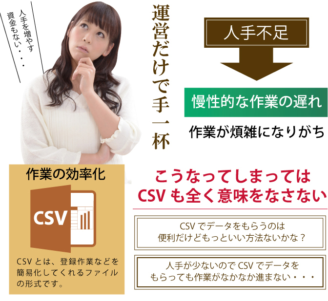 当社商品登録代行サービス 時間のかかる商品登録人手不足で作業が滞るCSVでの使い方がよくわからない通販サイト運営に関する悩みはどこもほぼ同じ。一緒に問題を解決していきましょう! |
