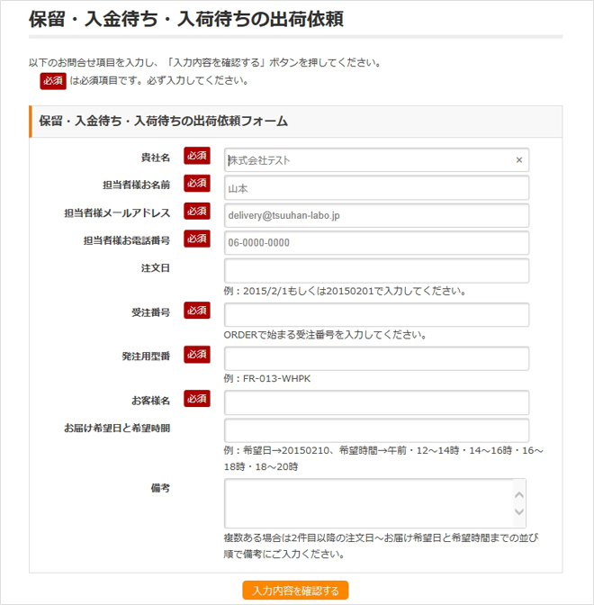 - 2件以上、出荷依頼がある場合は、備考欄に入力項目の「注文日」「受注番号」「発注用型番」「お客様名」「お届け希望日と希望時間」と同じ並び順にてご入力ください。